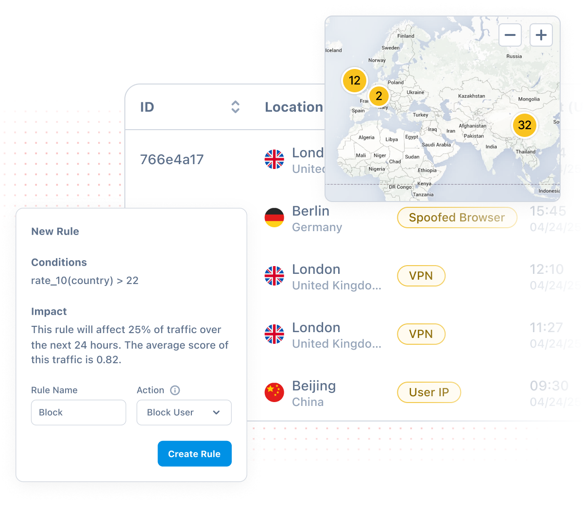Create and instantly backtest adaptive rules. Enforce responses in real time, from intelligent rate limiting to MFA challenges to blocking.