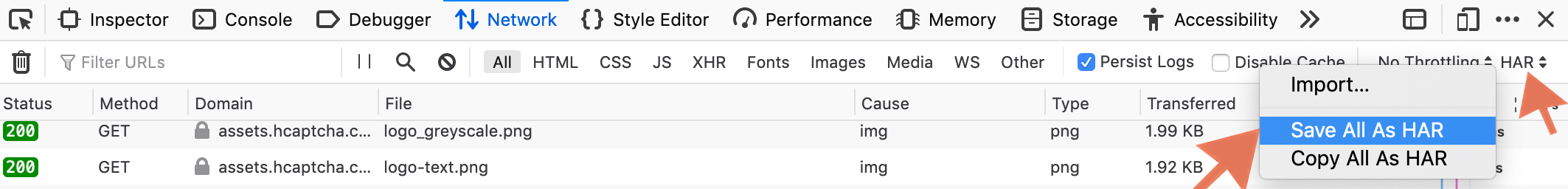 Step 4: Click "HAR" after you attempt to solve, and choose "Save All as HAR" to save the network log. Send that file to us.